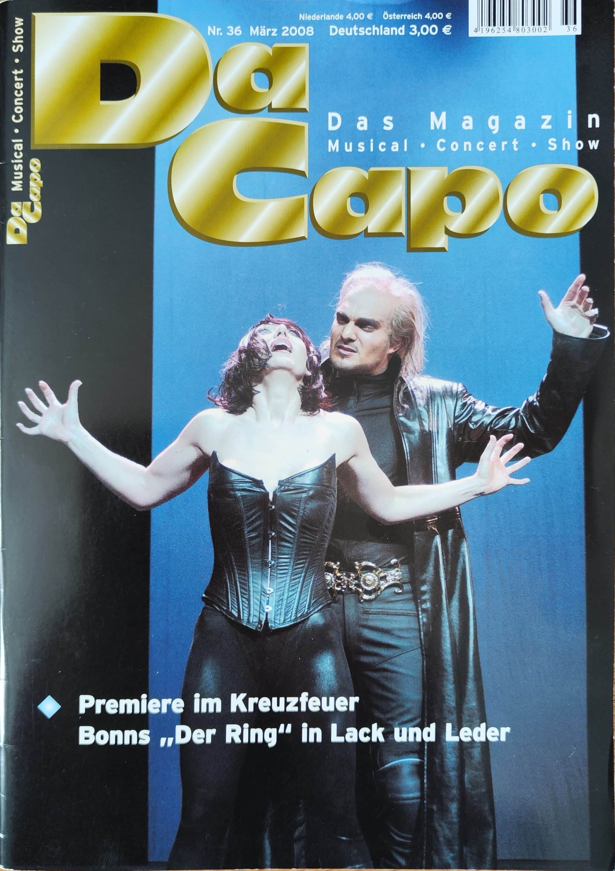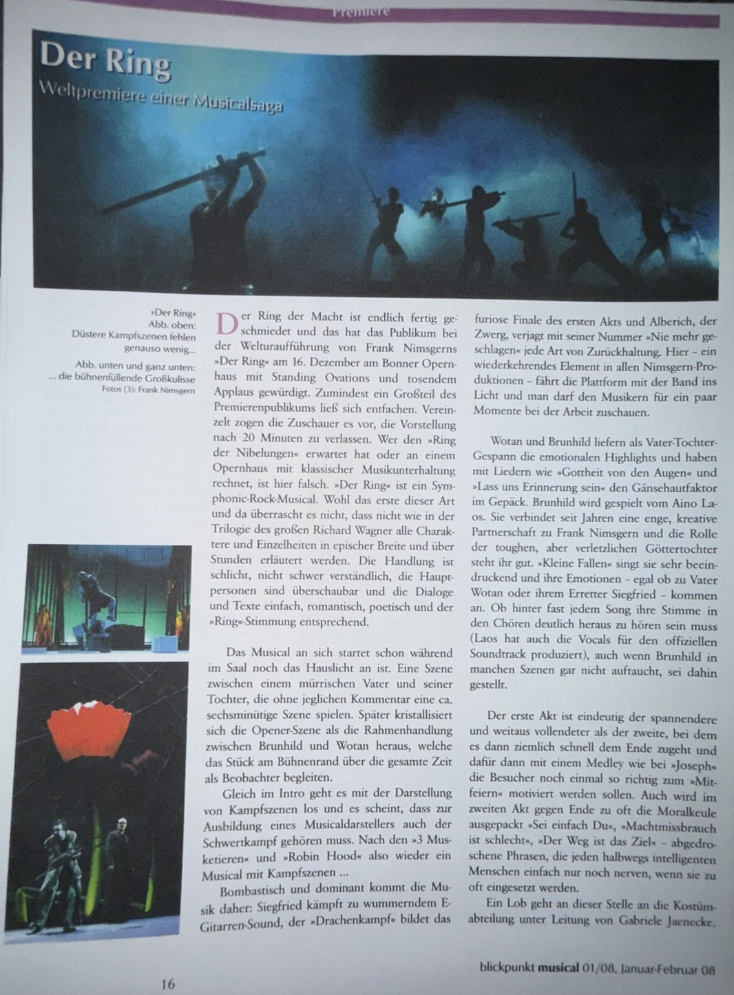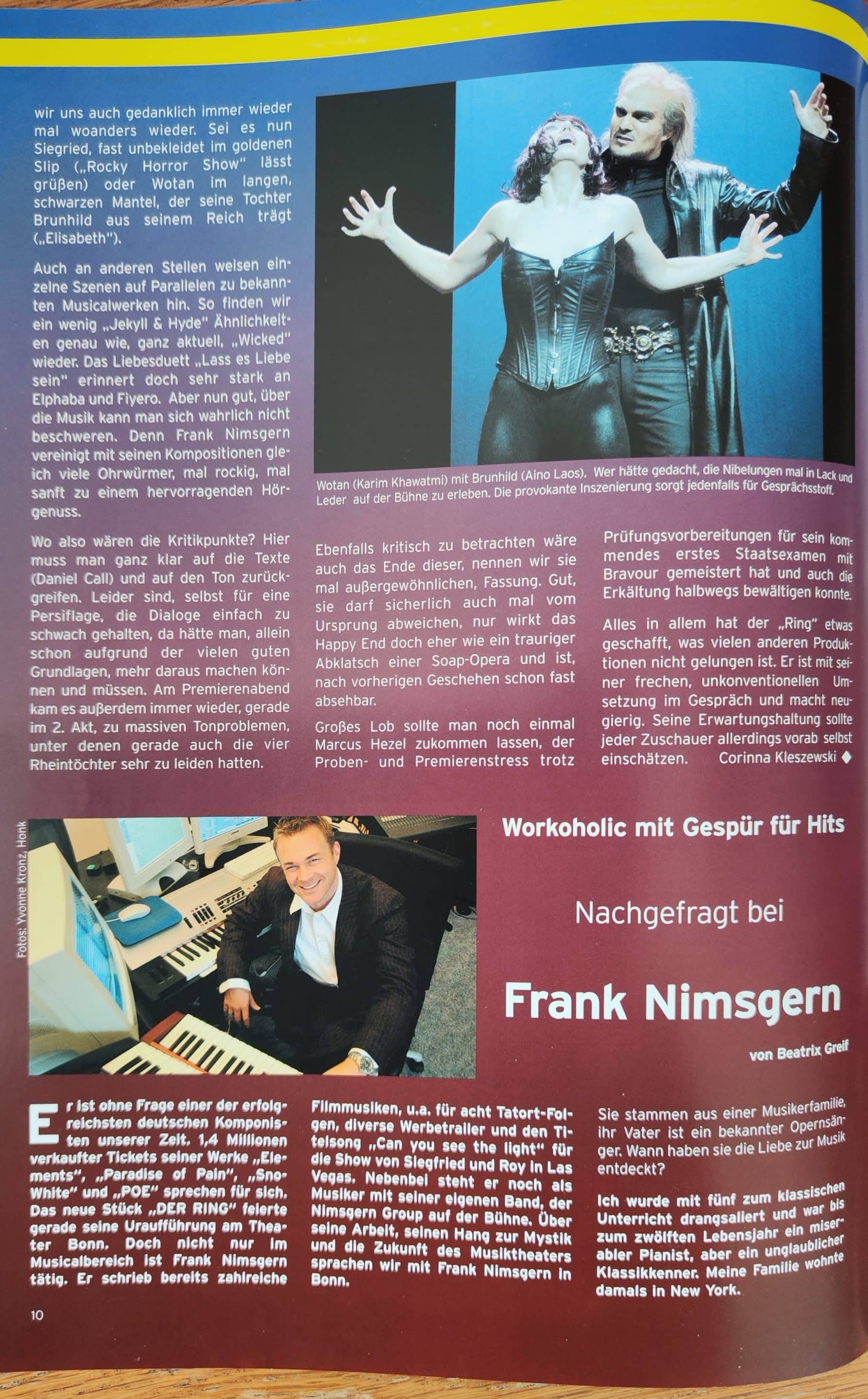 “His musical, also referred to as a ‘Symphonic Rock Musical,’ need not hide behind the great name of Richard Wagner—quite the contrary: his Ring is just as forceful and penetrating as Wagner’s, and that in ‘only’ 2 hours and 25 minutes. The stage of Theater Hof trembled under the weight of the mighty saga, matched by a cast of considerable star potential.”