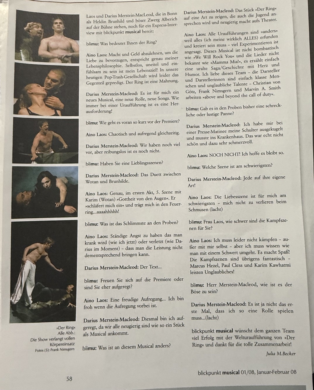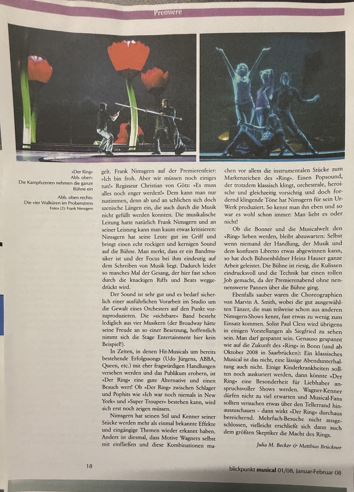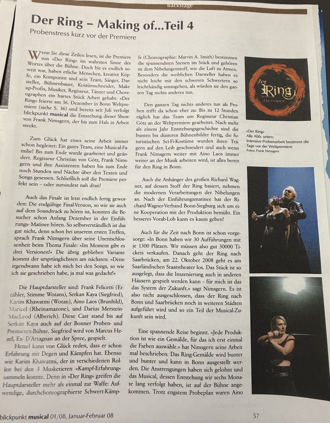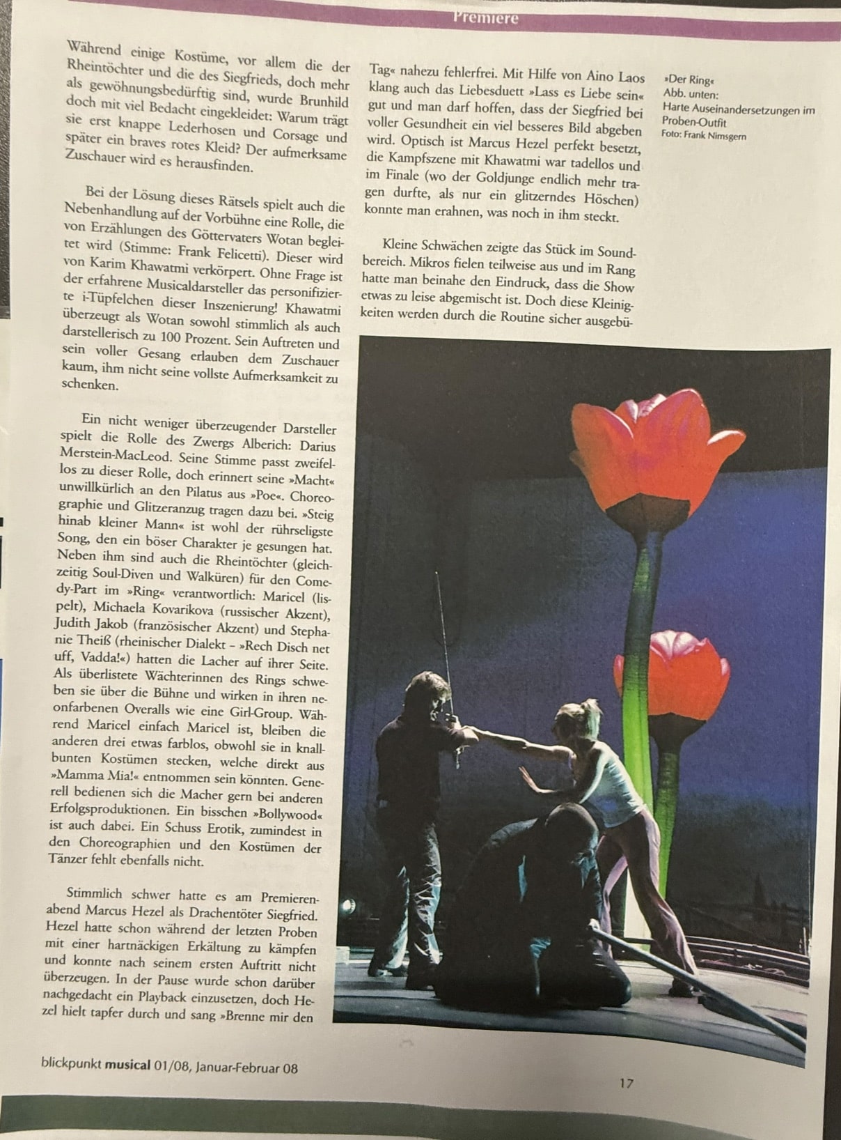 “His musical, also referred to as a ‘Symphonic Rock Musical,’ need not hide behind the great name of Richard Wagner—quite the contrary: his Ring is just as forceful and penetrating as Wagner’s, and that in ‘only’ 2 hours and 25 minutes. The stage of Theater Hof trembled under the weight of the mighty saga, matched by a cast of considerable star potential.”