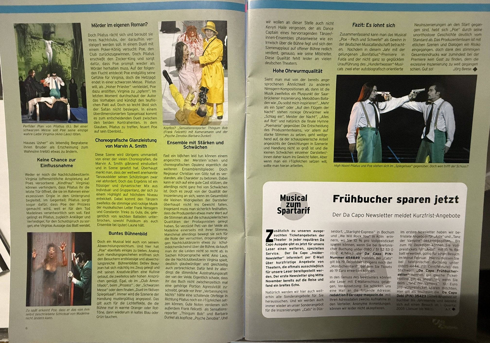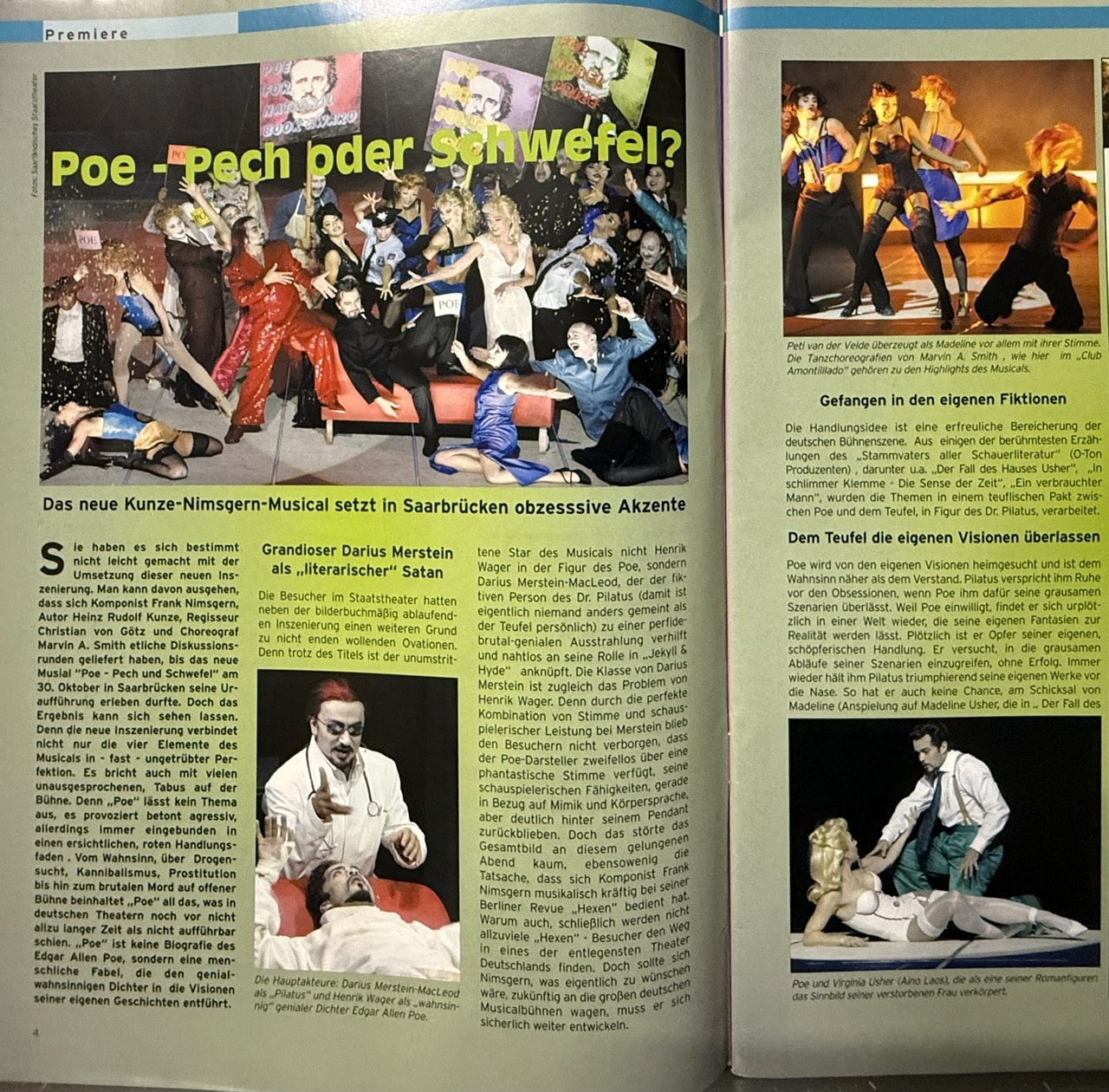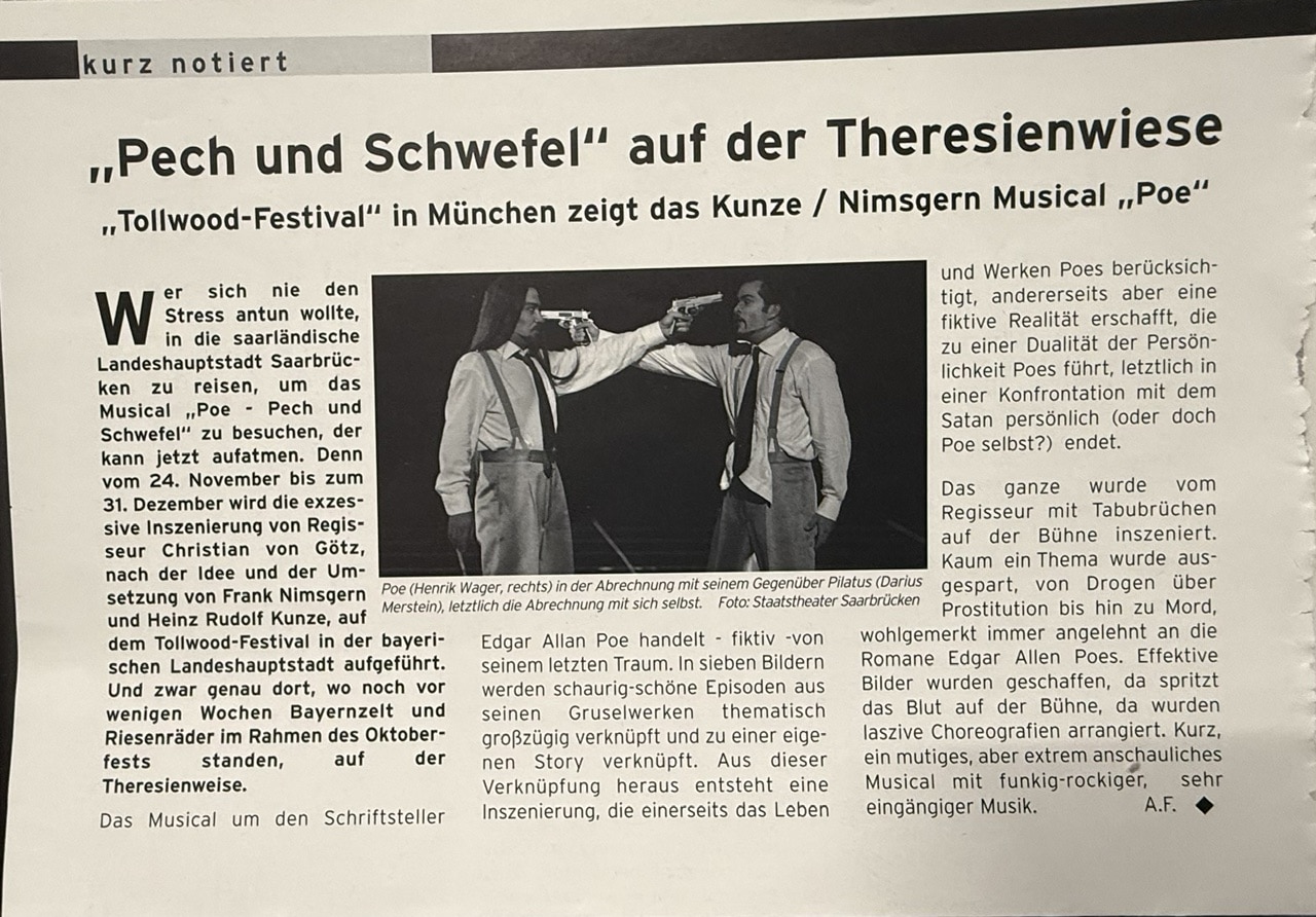 World premiere in 2004 at the Saarländisches Staatstheater, followed by a new production in 2005 at the Tollwood Festival in Munich. The central character and creative source for this musical is the forefather of Gothic literature, Edgar Allan Poe. In seven scenes, thematically inspired by Poe’s most famous stories, the musical tells the story of a fateful pact with the devil.